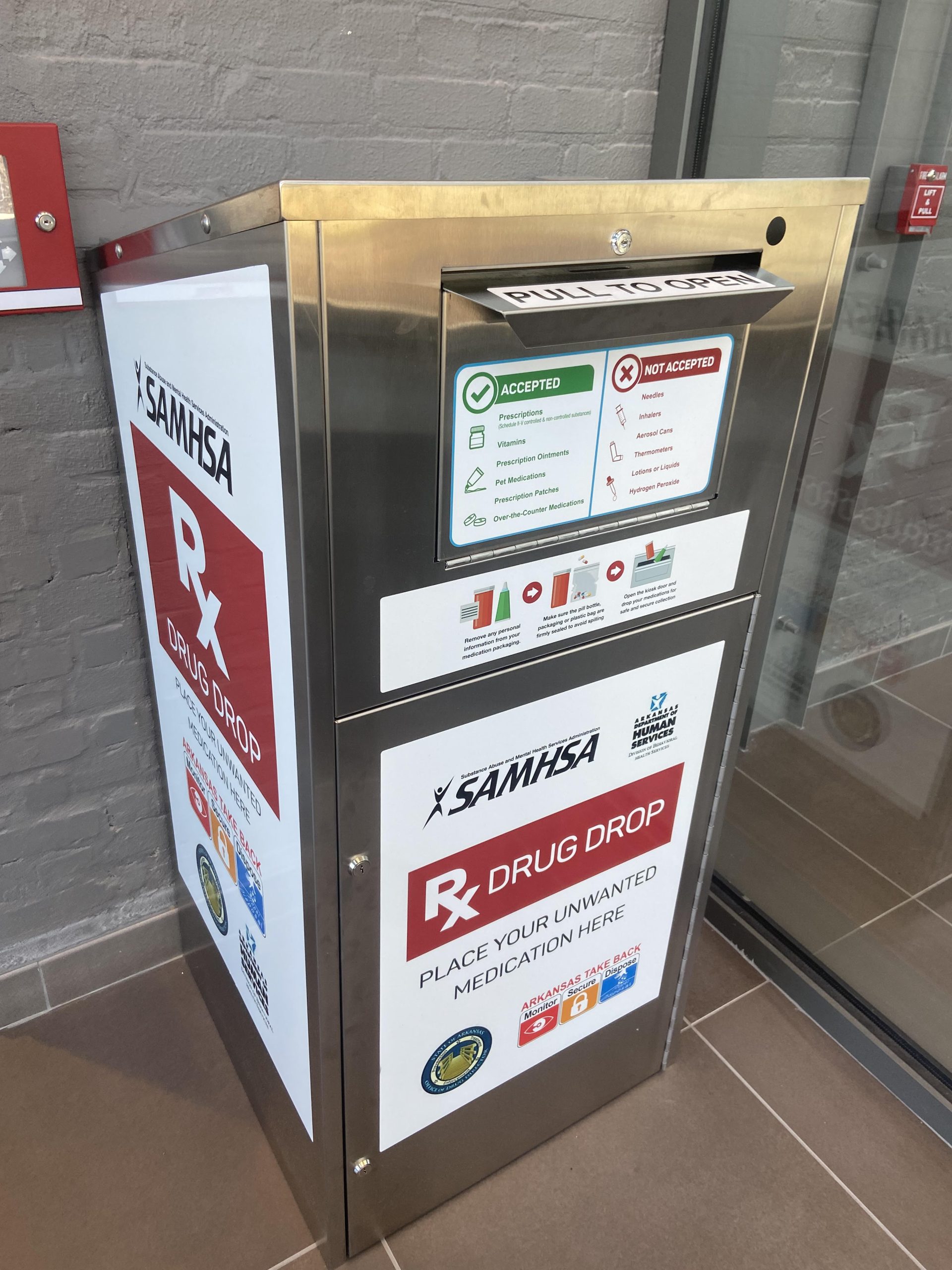 The Little Rock Police Station located at 615 W. Markham has a drug take back station (image left) in the main entrance lobby.