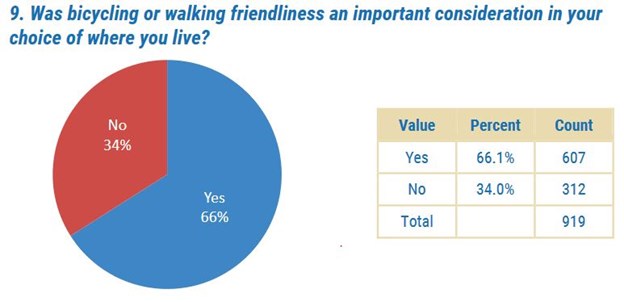 One attribute often associated with high livability scores is a bike– and pedestrian-friendly environment (Fig. 1). Arkansans link BikePed-friendliness with livability; in addition to the video above, an ArDOT survey (Appendix A) found that BikePed-friendliness was an important consideration for 66% of Arkansans in choosing where to live (Fig. 2). Little Rock Metro residents associate BikePed-friendliness with livability; Metroplan’s Central Arkansas Livability Index considers how walkable and bikable our city is in its calculation (pg. 5-6).
