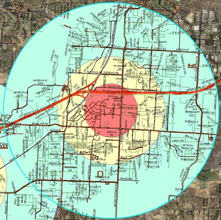 Figure 4. This is a representation of sidewalk facilities 2 miles (bright blue circle), one mile (yellow circle), and 1/2 a mile from Cloverdale Middle School. Maroon lines represent where sidewalks exist, green and black lines represent roads without sidewalks. LRPS school buses will not pick up students who live within two miles of a middle school.