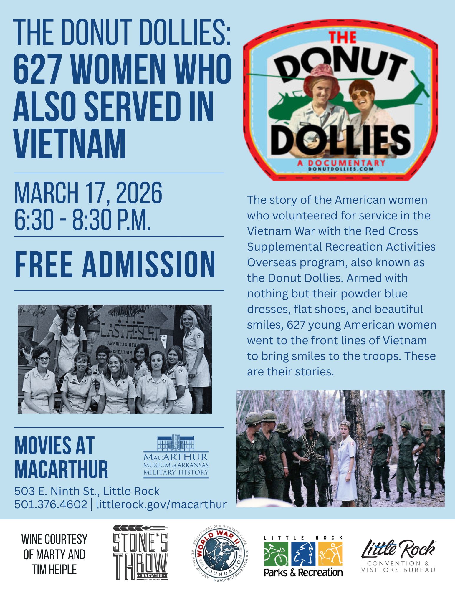 Join us Tuesday March 17, 2026 at 6:30pm for the showing of The Donut Dollies: 627 Women who also served in Vietnam. This is the story of the American women who volunteered for service during the Vietnam War with the Red Cross Supplemental Recreation Activities Overseas Program to bring smiles to the troops.