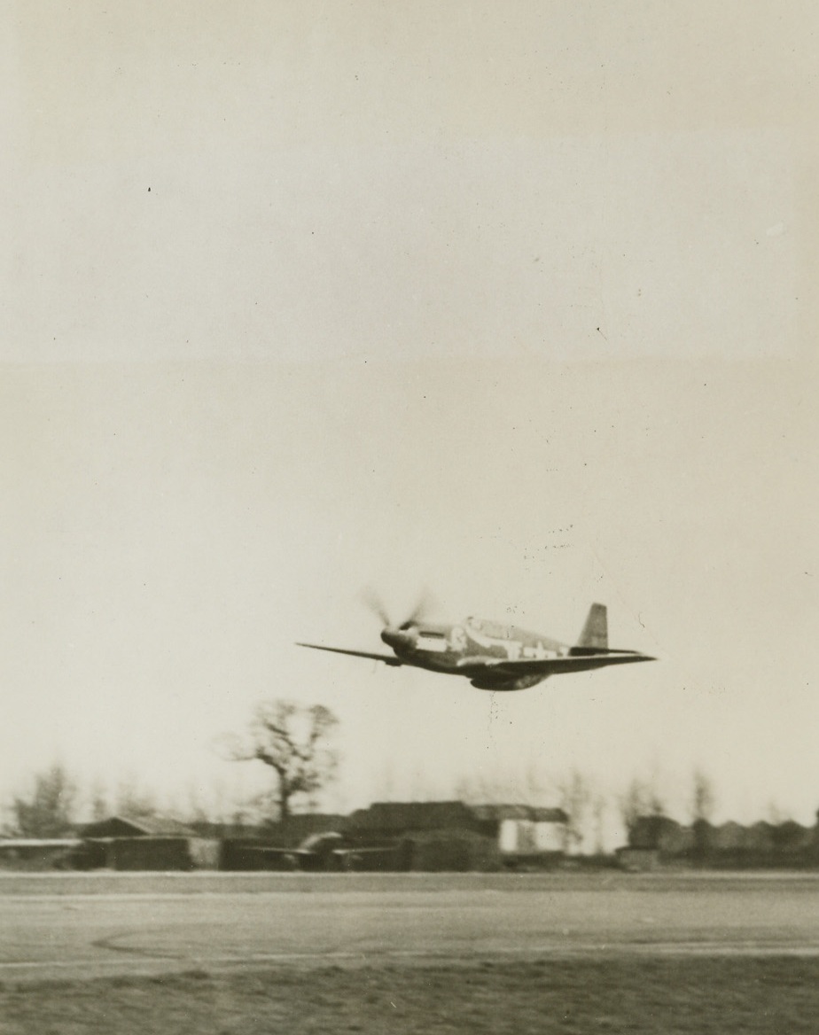 AMERICA’S 30-PLANE ACE IN ACTION, 4/12/1944. ENGLAND – Capt. Don S. Gentile of Piqua, Ohio, is the first American Ace of World War Two formally recognized as having broken Capt. Eddie Rickenbacker’s record in the last war of 26 planes, and yesterday, Gentile was decorated with the Distinguished Service Cross by Gen. Dwight D. Eisenhower. Last Saturday, Capt. Gentile downed three German planes when he led a P-51B mustang fighter group escorting U.S. Liberators on a mission over Northern Germany. At the same time, he received official confirmation for destroying five planes on the ground, bringing his current total to 30 – seven destroyed on the ground and 23 in the air. One of the few original members of the RAF Eagle Squadron still flying, Capt. Gentile transferred to the U.S. Army Air Forces in 1942. He now flies his mustang from a base in England, where he is shown (photo above).New York BureauWith the wheels of his mustang up, Capt. Gentile pulls the ship into a climb after taking off from his base.Credit: Acme;