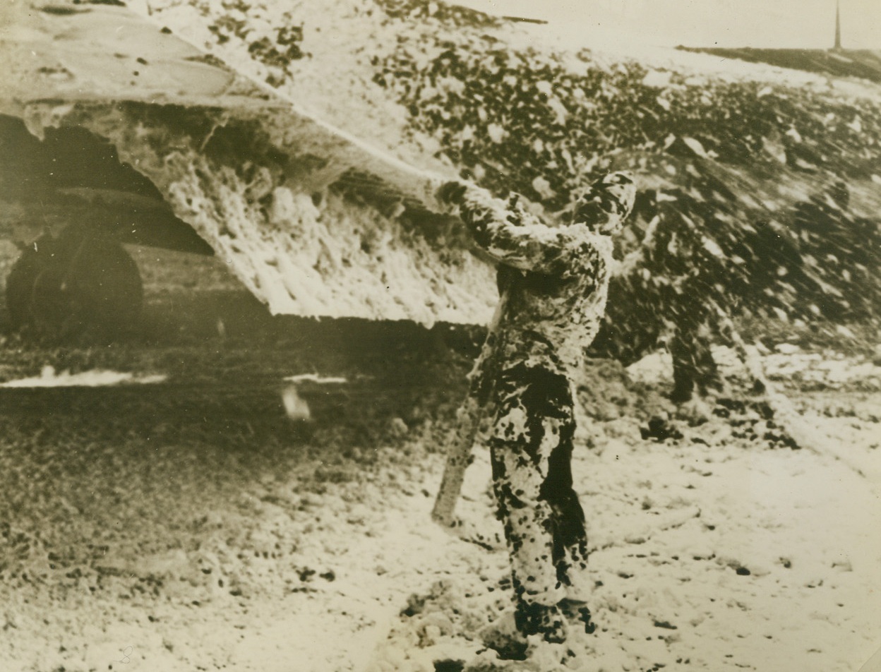 BENEFICIAL “BLIZZARD”, 4/27/1944. ENGLAND – Looking like the work of a blizzard in “Greenland’s icy mountains,” foamite covers this U.S. Flying fortress and firefighter, after a fier in the wing and one motor of the big ship had been extinguished. Flak set the blaze while the Eighth Air Force bomber was laying “eggs” on the Nazi fighter field at Achmer. Lt. Bernard T. Kuhlmeier, of Ft. Madison, Iowa, who flew the flaming ship back to its base in England, said the bomber was so full of smoke and fumes that he “couldn’t even see the instruments on the panel in front of me.” Nevertheless, he brought her home.Credit: USAAF photo from Acme;