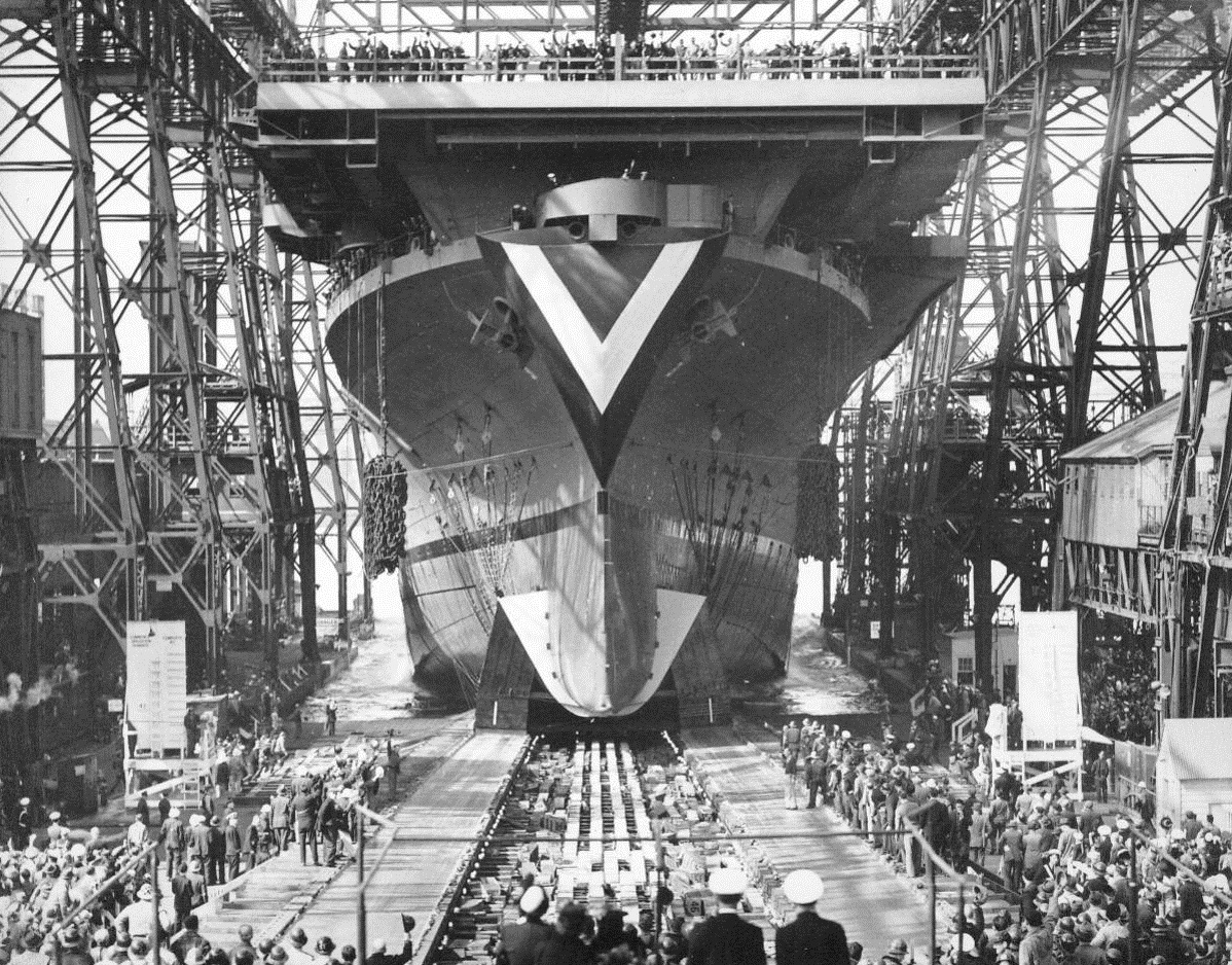 Open Aircraft Carrier Is Launched, 4/29/1944. New York City – Sliding down the ways under the impetus of 44,200 pounds of grease, the USS Don Homme Richard was launched at the Navy Yard this afternoon. The super aircraft carrier, which will house about 80 planes, including torpedo and scout bombers, is the thirteenth Essex class carrier to be launched since the U.S. entered the war. The ship, 850 feet long, is the namesake of John Paul Jones’ flagship, which had a keel length of 74 feet. Mrs. John S. McCain of Washington, wife of Admiral McCain, sponsored the carrier. Mrs. Frank Blasdel of Brooklyn and Mrs. Allen Raymond, of New York City, served as the matrons of honor. 4/29/44 (ACME);