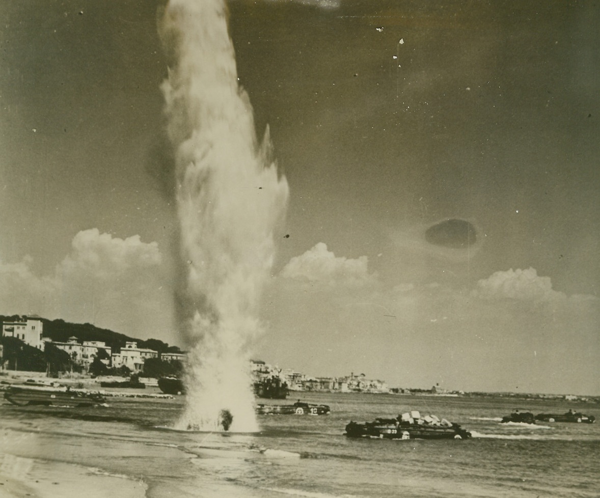 Nazi “Reminder”, 4/27/1944. ANZIO, ITALY — The camera catches the explosion of a Nazi shell, which throws a column of water high into the air narrowly missing an amphibious DUCK headed for the beach at Anzio. The shell served as a reminder to Allied forces operating the beachhead supply line that they are still within range — and within danger. The DUCK in the foreground is heavily loaded with supplies, while the others, (background), are empty and headed out to transports for a refill. Credit Line (U.S. Navy Photo from ACME);