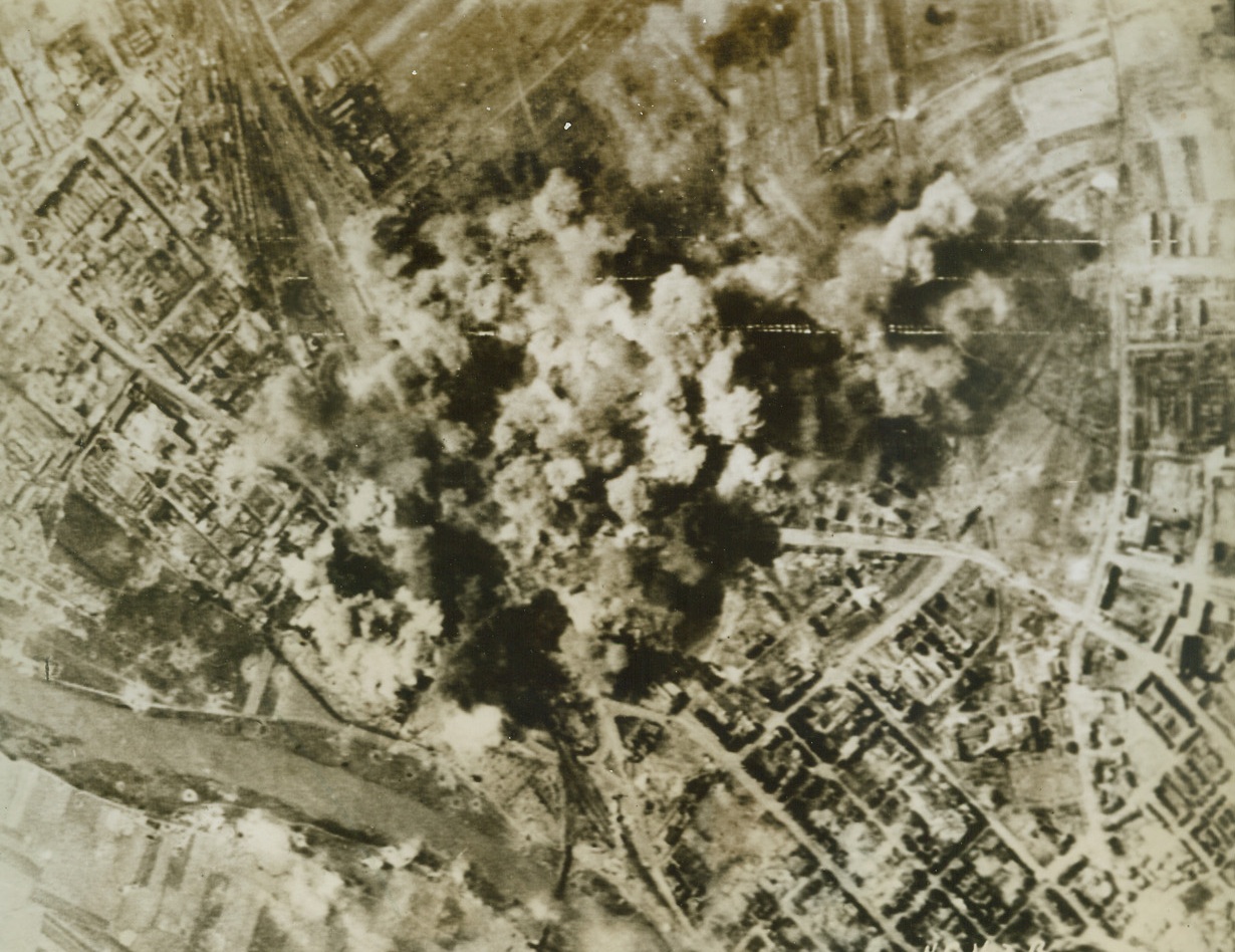 Damage Courtesy of the Allies, 4/29/1944. France – The R.A.F. bomber command recently dispatched more than 1,000 aircraft on a large number of operations, and in particular the offensive was resumed against railroad targets in France. Extensive damage was done to the railroad yards at Hirson in France. Clouds of smoke can be seen in this photo, taken at low level, covering the locomotive barns and repair shops. Many of the rail tracks leading into the barns and shops are seen to be wrecked, as well as freight cars near the shops. Credit: ACME;