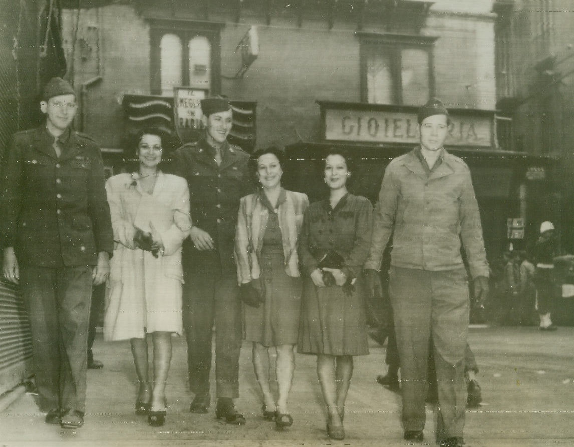 Time Out from War, 4/10/1944. NAPLES, ITALY – These U.S. soldiers take time out from the battle field to inject a little American tradition on to the streets of Naples, Italy. Walking along Via Roma with three local signorinas in typical Easter parade fashion are Pfc. Arnold Middendorf, Dubuque, Iowa, Pfc. Walter Sakala, Newark, N.J. and Pfc. Don Allen, Woonsocket, S.D. Credit Line (OWI Radio Photo from Acme);