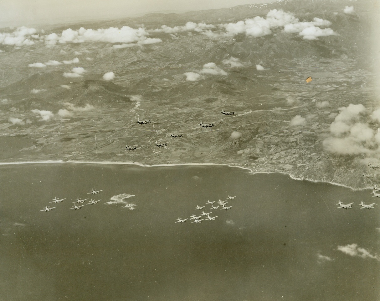 Air “Squeeze Play” on Axis (#3), 4/24/1944. SARDINIA – Hitler’s “Festung Europa” today, is being shattered and rocked by the greatest concentration of aerial might the world has ever seen. Day after day, in mounting numbers and with ever-increasing ferocity, huge masses of Allied bombers and fighters are blasting German war plants, communications, and airfields into crumbling and smoking ruin in preparation for “D Day” – and Allied invasion. These aerial armadas have occupied Europe in a gigantic pincers, with one “leg” in England, and the other in Italy and Sardinia. This series of photos shows U.S. B-26 Marauders taking off and operating from Allied fields in Sardinia, against the Southern Coast of France. Their target was the Var River railroad bridge near Nice. —Here, high over the coastline of Sardinia, the Marauders in groups of six, roar toward Southern France.Credit Line (Acme Photo by Charles Seawood from the War Picture Pool);