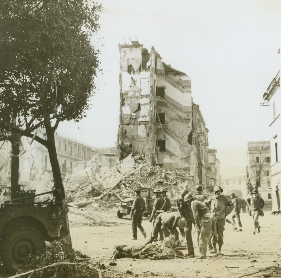 Anzio in Ruins After Heavy Battle, 4/22/1944. ANZIO, ITALY – Enemy resistance met by the Yanks when they stormed Anzio was heavy, as evidenced by the ruins in this street scene. Continuous shelling made a shambles of this street, which was in perfect conditions when the troops landed. in the foreground, a wounded soldier is being placed on a stretcher. Credit (Acme) (WP);