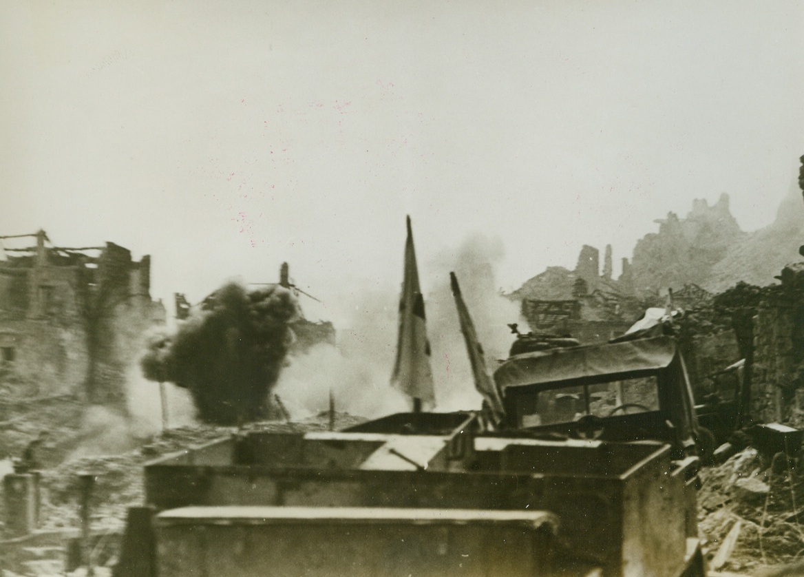 Destruction Follows German Troops, 4/23/1944. ITALY – Caption accompanying this picture received in New York from Lisbon described it as made in an “upper Italian town.” A German police unit which occupied a castle there “was attacked by a group of partisans who had taken possession of the town and besieged the German force for ten days.” A German relief unit is shown making its way through the battle-scarred streets of the partisan-held town.”Credit Line (Acme);