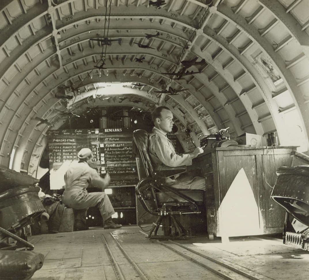 This Office Came From the Skies, 4/10/1944. An Air Base somewhere in China – Interior of cracked up transport is used as an office and alert shack. Operating the operations board is Sgt. Willard Mitchell, Portland Oregon. Sgt. Wm. Casto, Anaconda, Montana, is at the desk. Credit: ACME photo by Frank Cancellare, War Pool Correspondent;