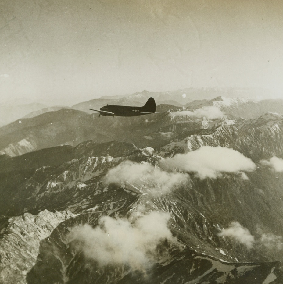 NO LANDING PLACE DOWN THERE, 4/16/1944. C.B.I. THEATRE—There’s no welcome mat for this strudy C-46 transport as it wings its way over the stern Himalayas following a hump route from India to China. Until the advent of the airplane, these high, sharp ridges successfully barred human transportation facilities. Now they are no longer a barrier, but they can still make a hump pilot’s life very tough.Credit: ACME.;