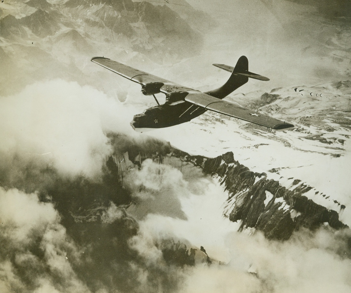 WHAT FLYERS IN ALASKEN AREA ARE UP AGAINST, 8/15/1942. Sudden snow storms are added handicaps to flying in the Northern Alaskan and Aleutian areas. Here, a Navy PBY Patrol Bomber and a “pillbox” as sandbags are almost obscured by a snow flurry. This picture describes more graphically than any words the difficulty encountered in maintaining the sky patrols in part of Alaska.Credit: U.S. NAVY OFFICIAL PHOTO FROM ACME;