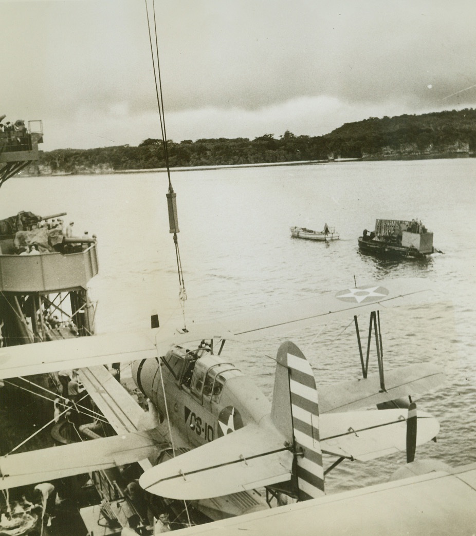 U.S. Supplies Land at Pacific Base, 8/13/1942. Crew members of a U.S. cruiser watch the operations as a landing lighter is towed ashore with tools and supplies for a U.S. built base in the Southwest Pacific. The base affords the U.S. a jumping off base to counteract Japanese actions in the area. Credit Line (ACME);