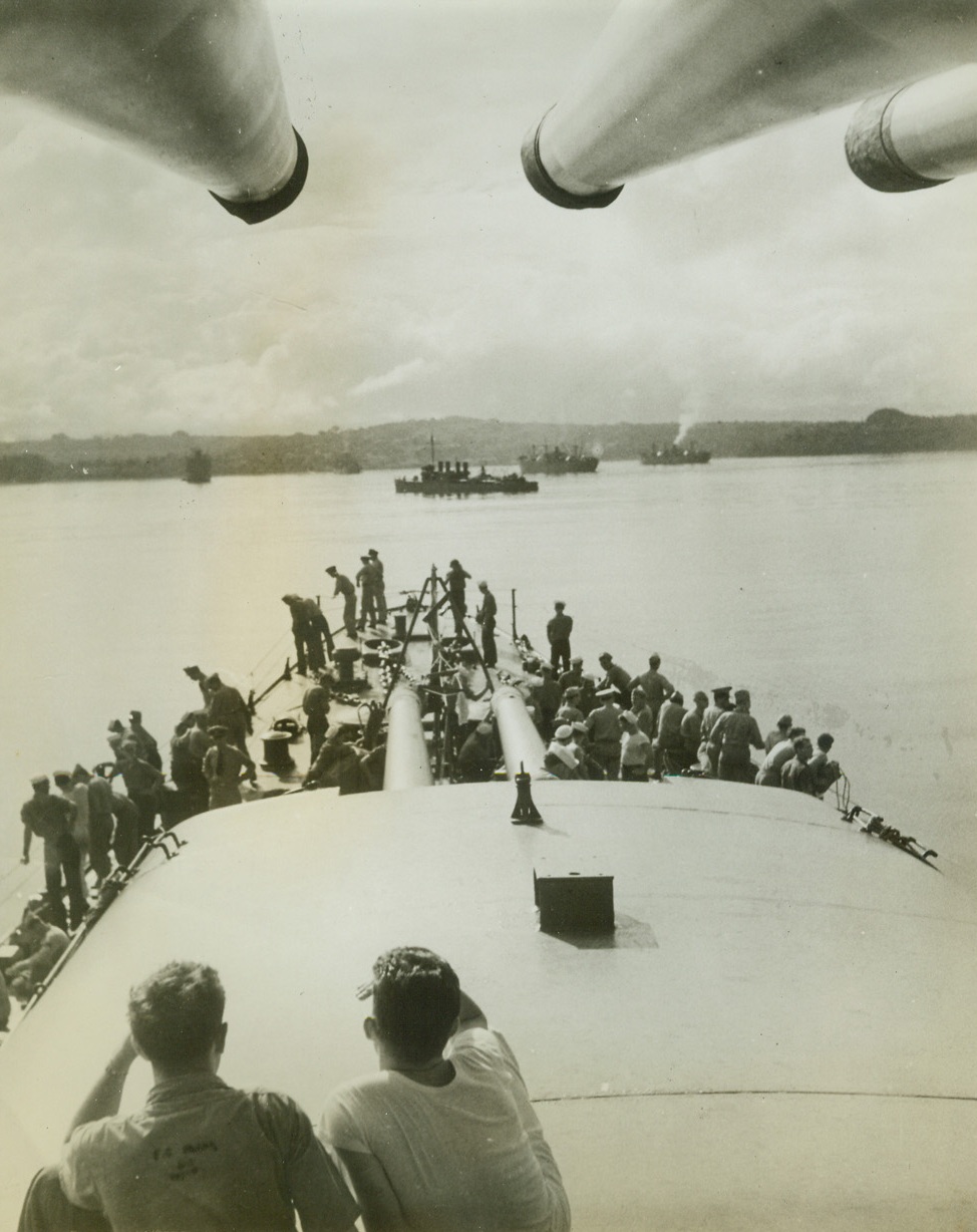 Convoy Supplies a Pacific Outpost, 8/13/1942. Under the protective eyes of a cruiser (foreground), and a destroyer (center), cargo ships of a United States convoy ease into an undisclosed harbor in the Southwest Pacific. Once safely in, they’ll drop anchor, and unload supplies for an American base. Credit line (ACME);