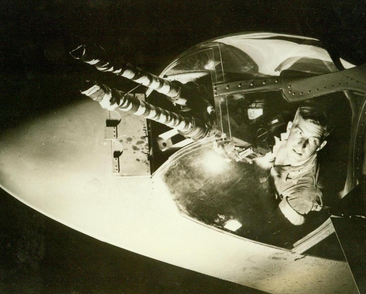 Itching Fingers, 8/14/1942. Macdill Field, Fla. – In wide-eyed alertness, the tail gunner of a B-26 scans the skies for the first sign of enemy opposition. He’s the man who holds the life of his flying teammates and the safety of his plane in his trigger fingers when the going gets toughest. His job calls for split-second timing in beating the foe to the punch. This gunner is an anonymous member of an operational training crew learning the finer points of his deadly art. The wrappings protect guns from weather. They come off when the plane goes into combat duty. 8/14/42 (U.S. Army Air Forces Photo From ACME);