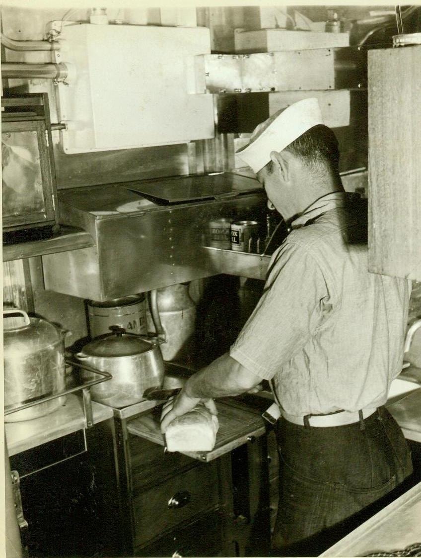 HAWAII’S GOT STINGERS NOW, 8/1/1942. HONOLULU – A palm-fringed, tropical lagoon is headquarters for a nest of sea-going hornets whose stings are deadly to any lurking Jap submarine or surface vessel off Oahu’s shores. It’s the home of the sturdy, speedy little PT fleet – the Navy’s torpedo boats that have recently joined land, sea and air offensives in Hawaii. In a former yacht clubhouse set beneath cocoa palms and huge Kamani trees, the officers and men of the fleet relax while their craft undergo check-ups and repairs, awaiting the time when they will put out to sea—for a day’s or month’s cruise—to “put the fish into an Axis ship”. Here are typical scenes at the secret base. NEW YORK BUREAU Size must be sacrificed to speed on the little PT boats, which pack a powerful sting in spite of that fact. The galley is a bit cramped, but this crew member has elbow room enough to slice bread. (Passed censors). Credit: ACME;