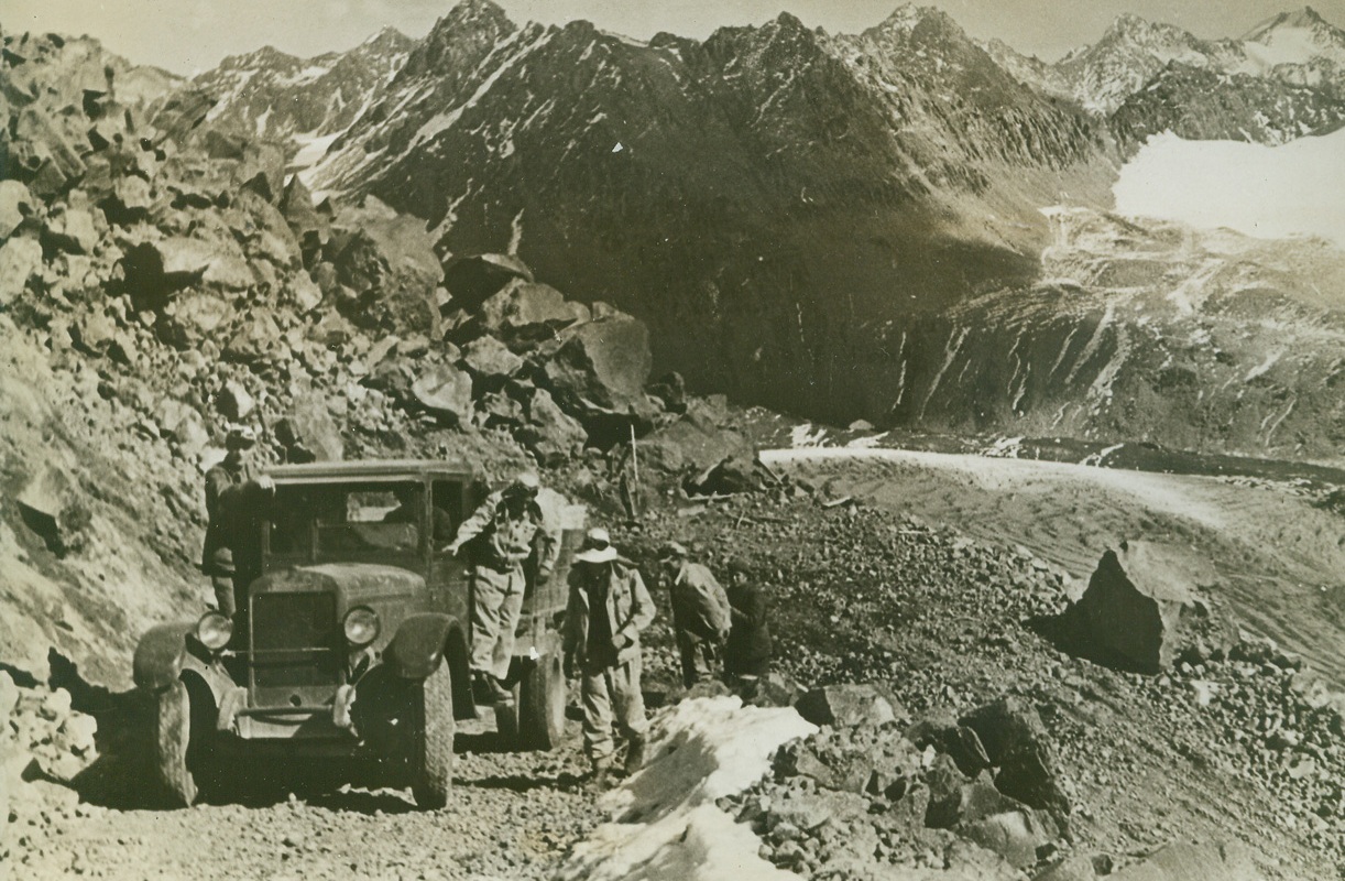 SKI TROOPS IN WINTER – MOUNTAINEERS IN SUMMER, 8/16/1942. PACIFIC NORTHWEST – A new branch has been added to Uncle Sam’s Army – A full-fledged “Mountain Regiment”, with 1,400 men who are undergoing a rigid and specialized training program. Last winter these same men formed the first organized ski troop battalion in the U.S., but now that the ice and snow has given way to summer heat and dust they are being developed into a regiment intended as a nucleus for similar units of mountain infantry. The regiment’s Commanding Officer, Col. O. S. Rolph, inaugurated the ski patrol and today personally supervises every phase of the thorough training of the “Mountaineer Infantry”. These photos, taken at the Mountaineering Training Area, show some phases of the training. At the Mountaineering Training Area the men scale the steep sides of a gravel pit and almost vertical wooden climbing ramps, 40 feet high and nicked at widely-spaced intervals with an axe to give toe and finger holds. Credit: OWI Radiophoto from ACME;