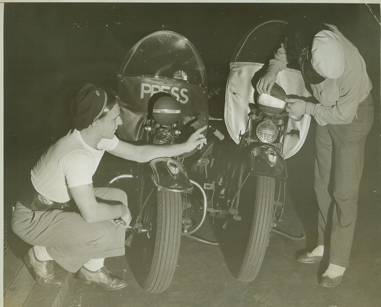Motorcycle Riders Join Dimout, 8/4/1942. NEW YORK, N.Y. – Two press motorcycle riders, who must be prepared to ride through blackouts, Jack Schultz, (left), and Frank Mote, both of Acme Newspictures, Inc., tape up their headlights to conform to the ruling that auto lights be dimmed out to the intensity of parking lights, beginning August 4th. For the first 10 days, violators will only be given warnings. After that, magistrates will be empowered to impose penalties up to $50 or 30 days, or both. Credit: (ACME);