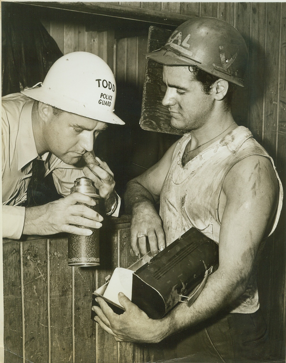 SABOTEURS KEEP OUT!, 8/4/1942. NEW YORK, NY – After four Nazi saboteurs landed on the shores of Long Island, and four on a Florida beach, recently, with detailed plans for the destruction of various installations of tremendous value to the American war effort, it became very apparent that the Axis wasn’t – and isn’t fooling. For that reason, war plants, shipyards, and other important installations are now taking precautions. An Axis saboteur would have a tough time of it trying to get into the Todd Erie Basin Drydocks, a Brooklyn unit of the Todd Shipyards Corp., for here is one of the plants that realizes the full danger the yard installations and personnel would be in, should they allow one chance to saboteurs. Therefore, they are taking no chances, as this series of photos passed by Navy censors shows. Even an innocent looking lunch box may contain a bomb! – Albert Califano, (right), has his lunch box open for inspection by Guard Philip Mayer, who smells the contents of the thermos bottle, to be sure it doesn’t contain dangerous chemicals. Credit: OWI Radiophoto from ACME;