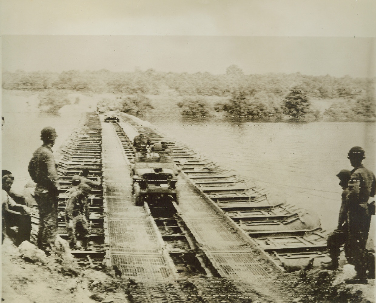 Patton Stays Up Front, 8/30/1944. France – A U.S. Jeep, carrying Lt. Gen. George S. Patton, rolls across a pontoon bridge over the Seine River on the heels of his rampaging 3rd Army. He was the first American officer to set foot on the northern bank of the historic river in this war. Credit (Army Radiotelephoto from ACME);