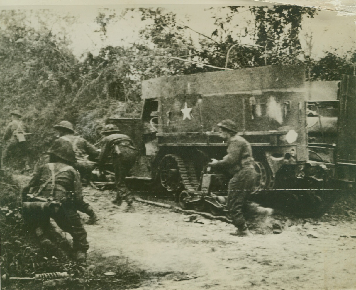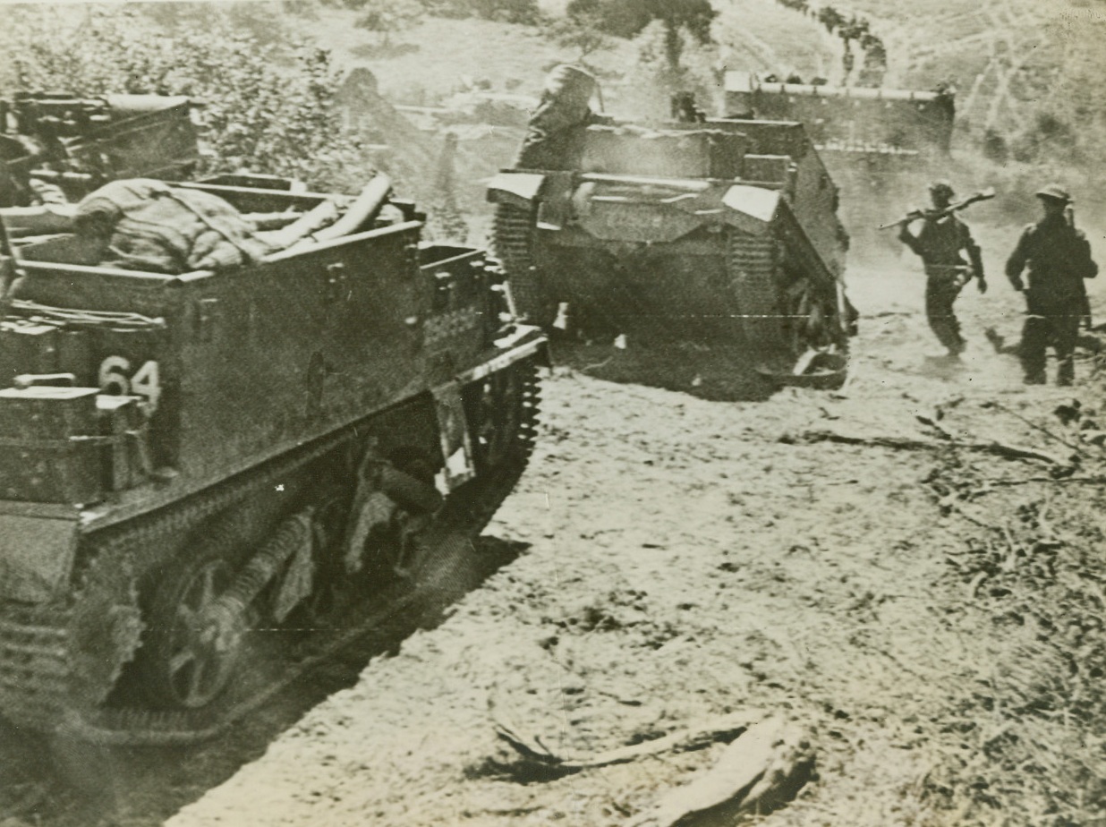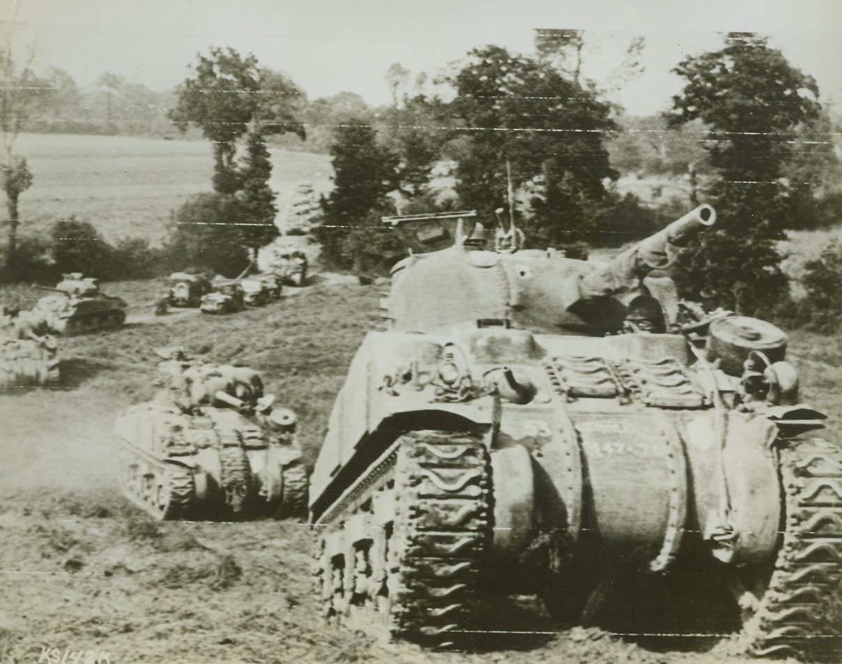 Forward On The Victory Road, 8/1/1944. Caumont, France – During a British attack on the Caumont area, infantry and armored vehicles move forward to the front lines, as the British offensive continues to advance. Credit: British Official Photo via US Army Radiotelephoto from ACME;
