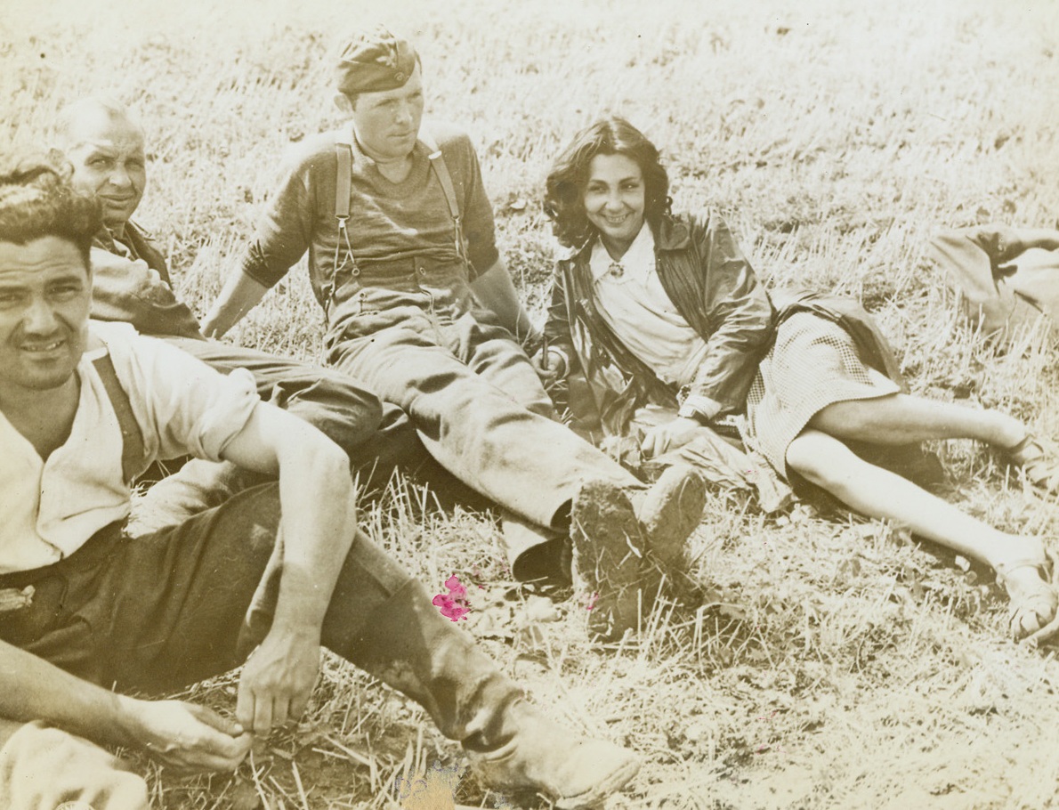 Grapes In Southern France Not Sour, 8/18/1944. France – Four American soldiers relax after storming the beaches of Southern France and dig into some of the famed French grapes found along the Riviera. Eating with relish are (left to right): Pvt. Donal Cheperka, Elgin, Ill.; Sgt. Antonio Oppio, Reno, Nev.; Cpl. William T. Pribble, Nocona, Tex.; and Cpl. John Uecker, Marshall, Minn. Cpl. Uecker studies a map while enjoying the fruit. Credit: Army Radiotelephoto from ACME;