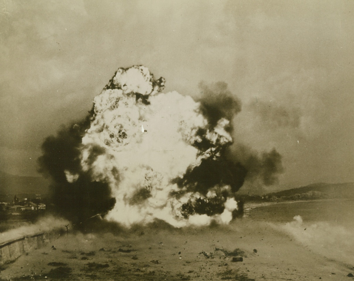 Invasion Practice for Yanks, 8/15/1944. U.S. Infantrymen lie flat on their faces in the sand, as their Bangalore torpedoes explode, shredding “enemy” barbed wire barriers along this “invasion” beach. This scene was, and is being reenacted along the shore of Southern France, as Allied forces pour ashore to establish the fourth front. Credit: Army radiotelephoto from ACME.;