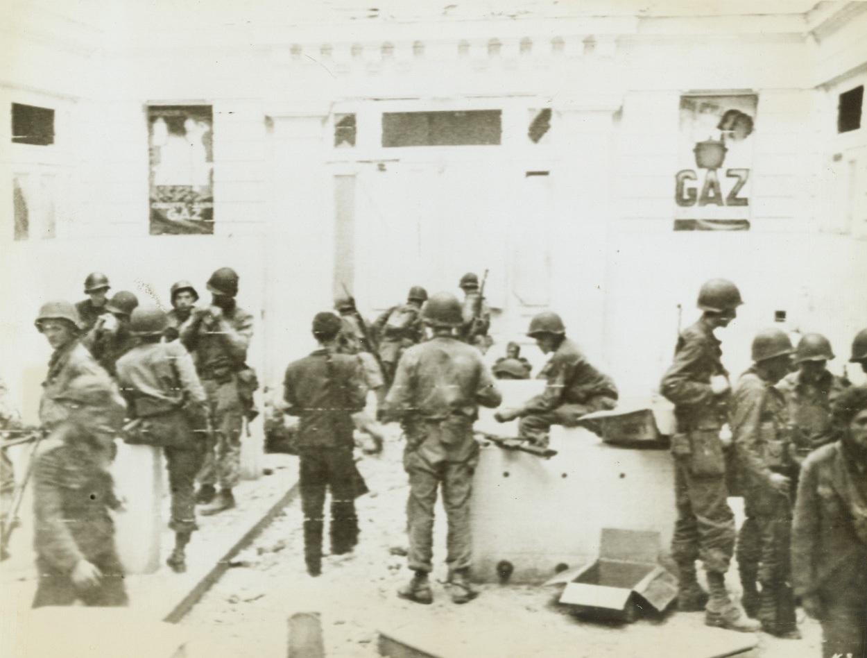 Step-by-Step Advance, 8/21/1944. Dinard, France—Hugging the wall of the casino building in Dinard, American infantrymen crouch as they advance. Making their slow way up the street, the Yanks are wary of German sniper fire. Credit: Signal Corps photo from ACME;