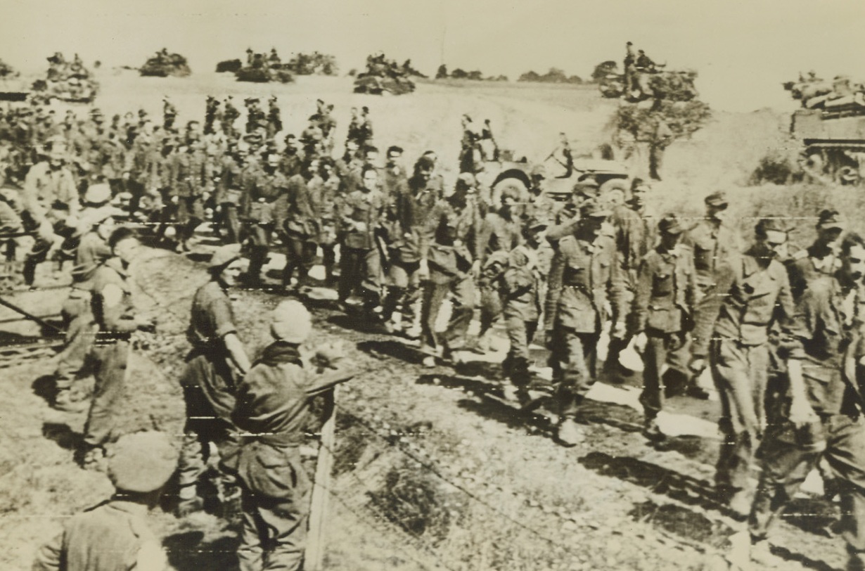 France – Military traffic streams through devastated St. Lo, just a little while back the scene of terrific battles, but now far behind the fighting front. Yank advance through Brittany is at a speed almost greater than that achieved by any army in World War II. Credit: Army photo from ACME; , 8/22/1944. St. Tropez, France – Yanks in the rear lines are kept busy tabulating the war prisoners that come in by the thousands. Here American Military Police keep track of the droves of Nazi prisoners near St. Tropez, France, following their capture by Allies pushing northward from the southern France beachhead. Credit: US Army Radiotelephoto from ACME;