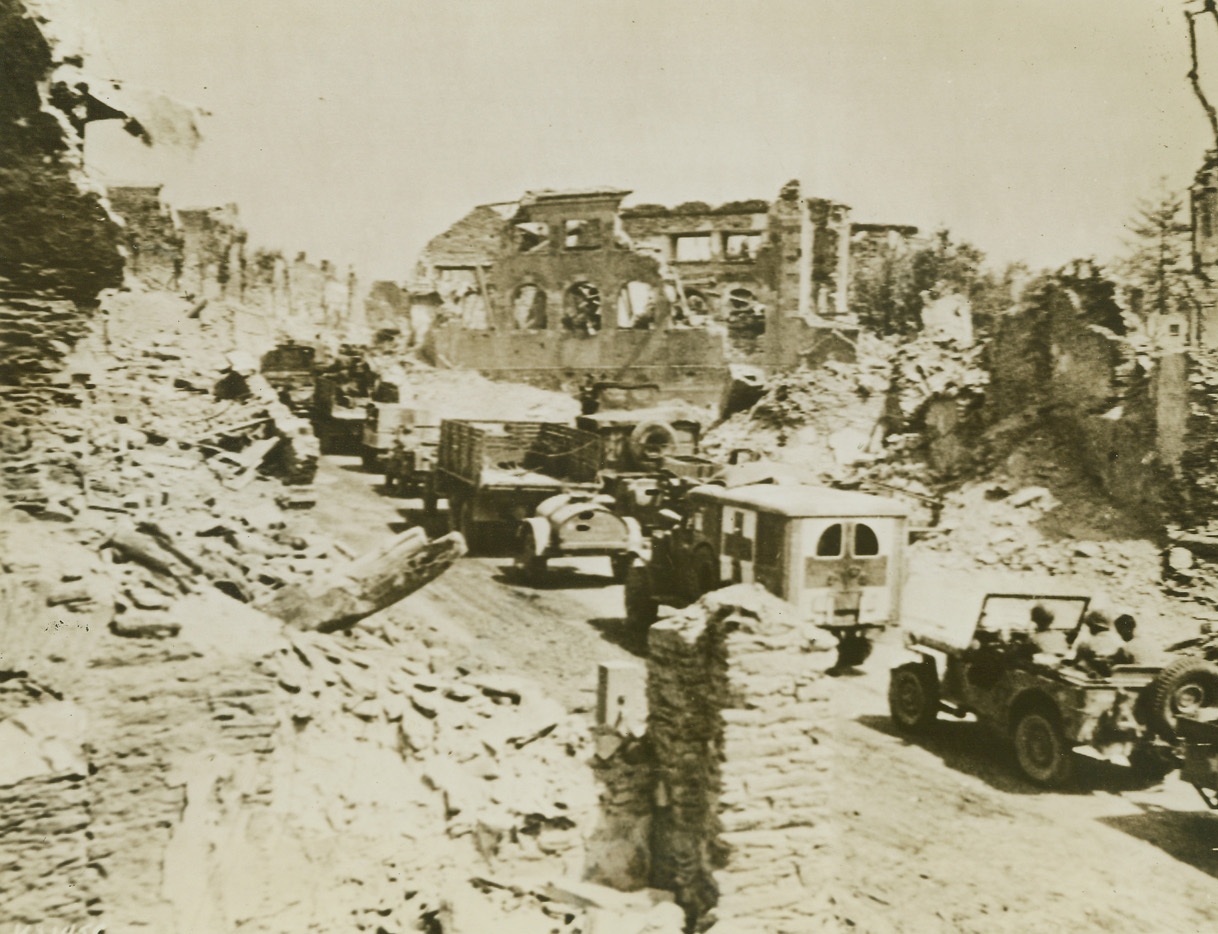 St. Lo Now at Yank Rear, 8/5/1944. France – Military traffic streams through devastated St. Lo, just a little while back the scene of terrific battles, but now far behind the fighting front. Yank advance through Brittany is at a speed almost greater than that achieved by any army in World War II. Credit: Army photo from ACME;