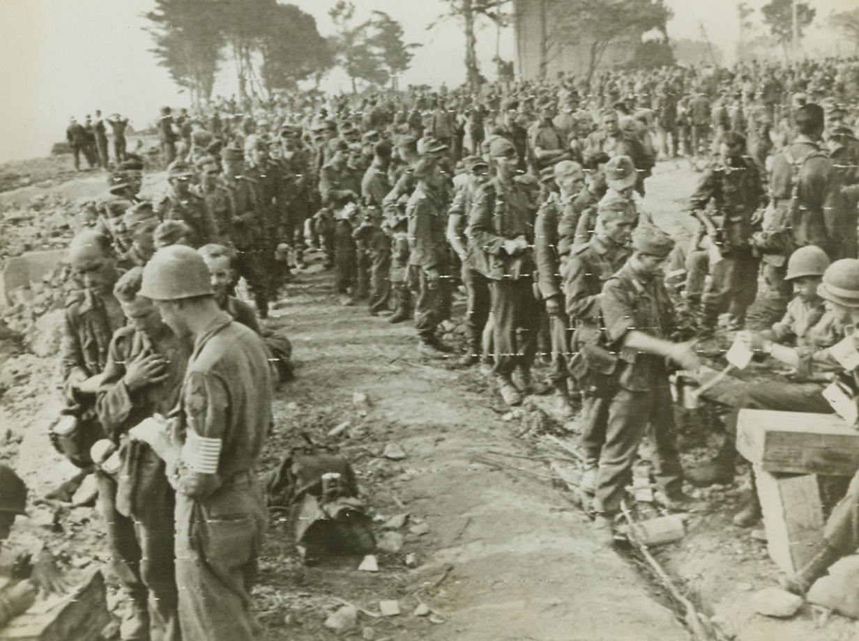 Ten Thousand Hungry “Supermen”, 8/29/1944. France – In this compact mass, stretching far into the background, are ten thousand German prisoners, captured during the Allied drive in France. It’s “chow time” here, and they’re lining up for their lunch in their stockade somewhere in France. Credit: Signal Corps Photo from ACME;