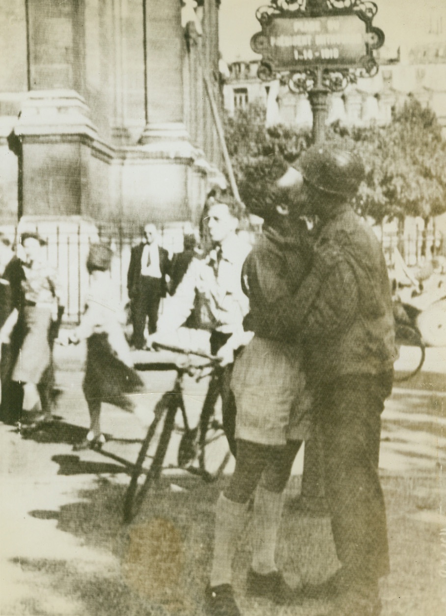 Not Amour – Gratitude, 8/28/1944. Paris – In gratitude for the liberation of his beloved capital, a French civilian gives the traditional exuberant greeting to a Maquis, a member of the French forces which drove the Germans from Paris. Civilians, accustomed to such scenes, pass by with hardly a glance. Credit: Signal Corps Radiotelephoto from ACME;