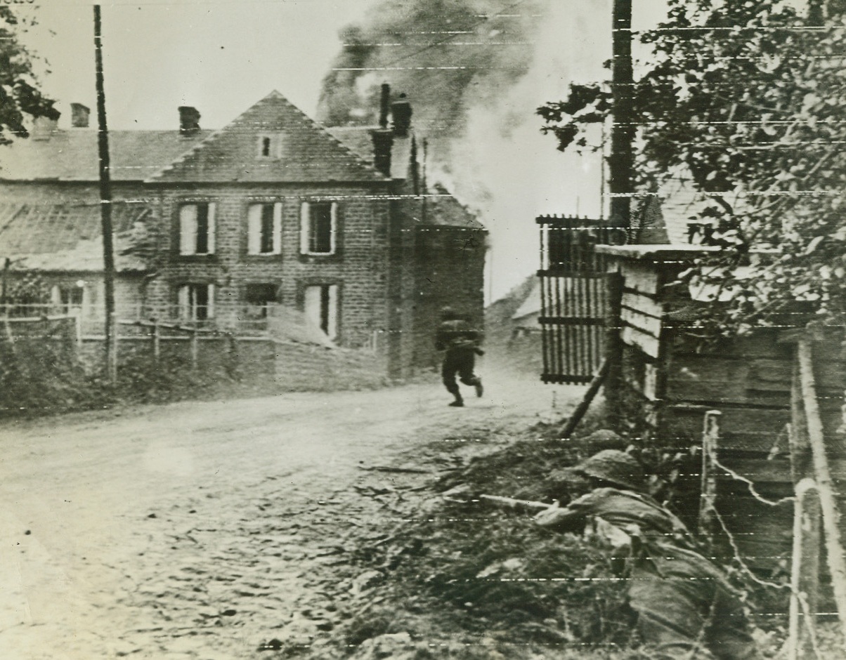 Looking for Snipers, 8/8/1944. France – A British infantryman, his gun held ready, dashes across a road in Montchauvet, while two of his buddies (right, foreground) cover him. The men are after snipers hiding in buildings in background. Credit: British War Office photo via Army Radiotelephoto from ACME;