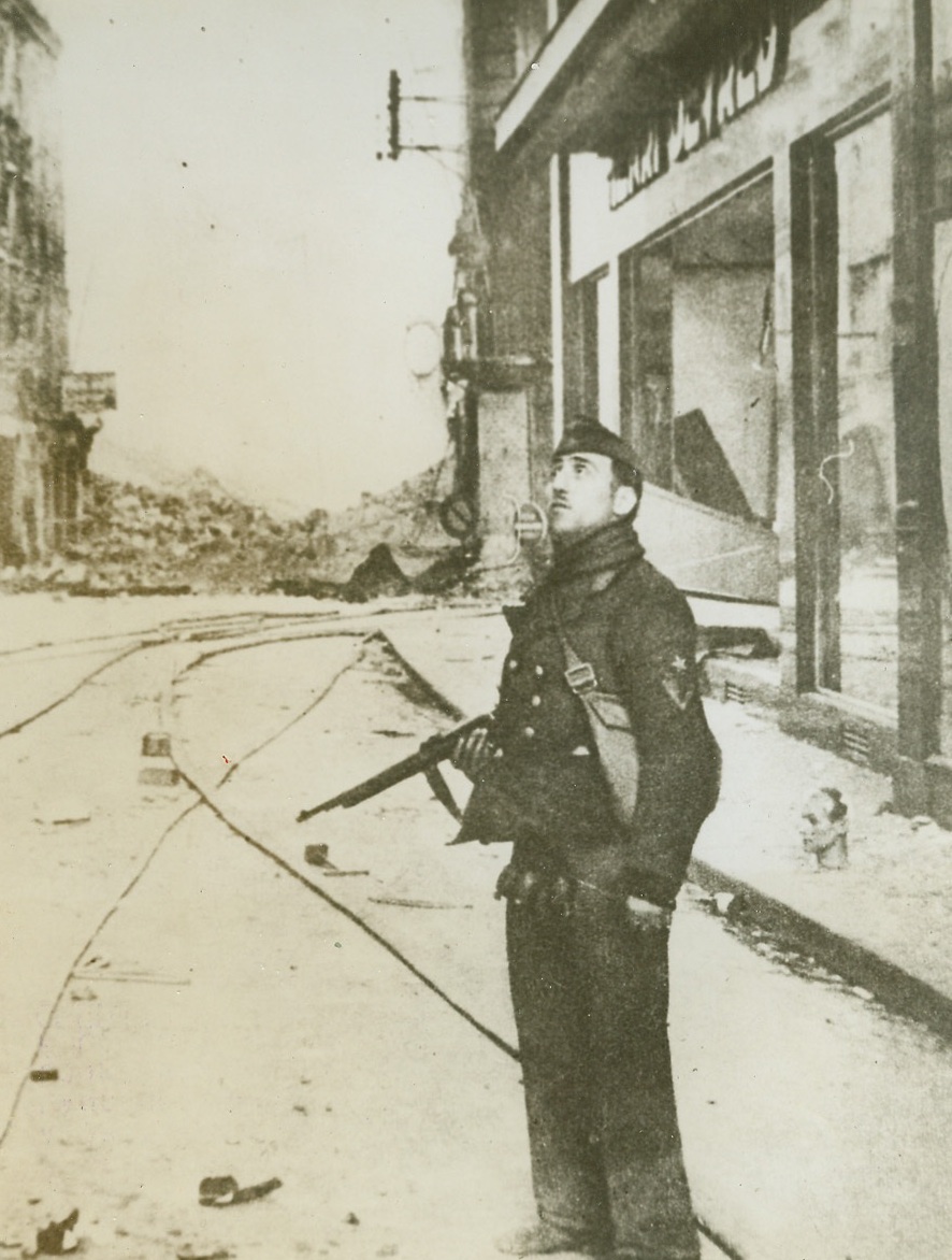 Snipers Above, 8/28/1944. PARIS — Eyes on a rooftop where an enemy sniper has been spotted, men of the FFI and the Second French Armored Division are ready to let ’em have it during street fighting in the heart of Paris. Behind the valiant patriots are German trucks that were captured by the Maquis. Credit:-WP-(ACME Photo by Andy Lopez for the War Picture Pool);