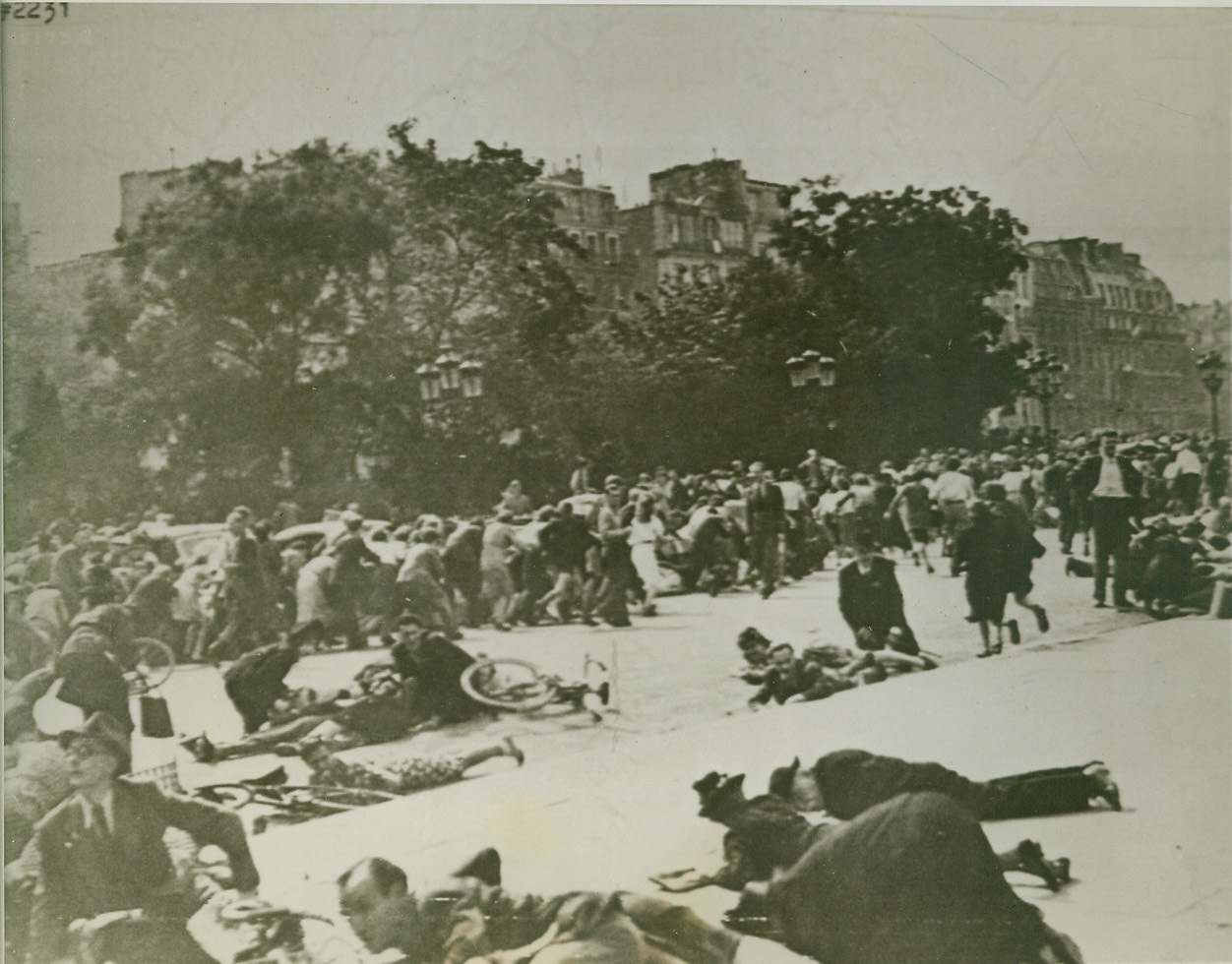 Paris Celebration Ends in Riot, 8/27/1944. Paris, France—A few minutes before the scene of a triumphal procession celebrating the liberation of Paris, this street in the vicinity of the Eiffel Tower is now filled with people scrambling to escape the rifle fire of Nazis and collaborationists quartered in nearby buildings. It was during this procession that an attempt was made on the life of Gen. de Gaulle. The photographers in the foreground, taking pictures as the people scramble for shelter, are probably war picture pool correspondents. Credit: ACME photo via Signal Corps;