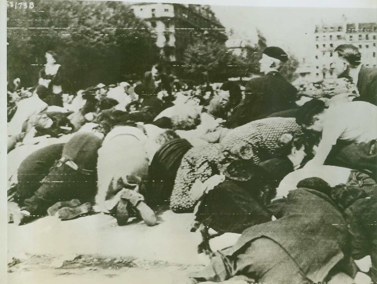 Hugging the Streets for Safety, 8/28/1944. PARIS — Keeping their heads during the panic that ensued when German snipers fired into crowds outside Notre Dame Cathedral, Parisians stretch out on the pavement for safety. In the background, scores of frightened civilians run through the street. This is a British War Office Photo. Credit: (Army Radiotelephoto from ACME);