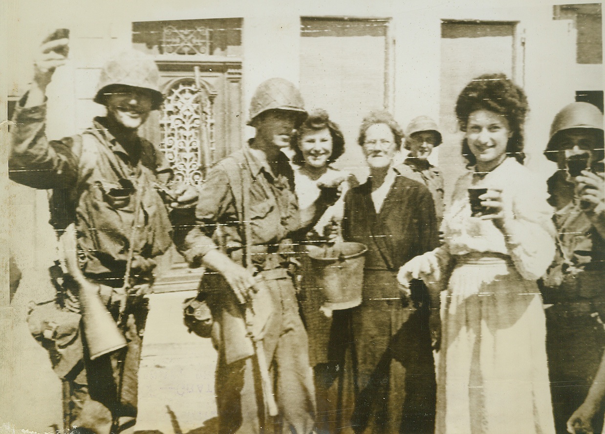 Wine “Bucket Brigade”, 8/17/1944. France—Grateful natives of this town in Normandy bring wine in buckets to refresh Yank liberators passing through the streets. Credit: Army radiotelephoto from ACME;