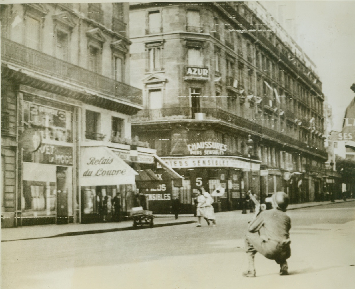 Snipe-Hunting in Paris Streets, 8/28/1944. Paris—As two French Red Cross nurses scurry for safety from a sniper who opened fire from a building in Paris, an American infantryman, with no shelter, kneels in the street and seeks to locate the sniper. Credit: Signal Corps radiotelephoto from ACME;