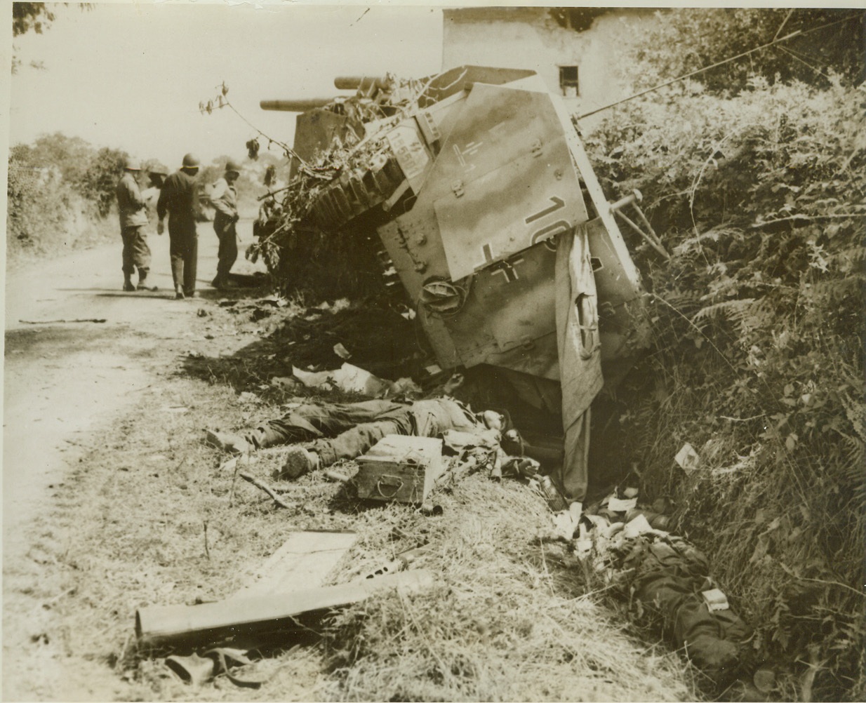 Where Nazi Panzers Were Trapped, 8/3/1944. France—Wrecked German armored vehicles and their dead crew members lie along this road in Roncey, where they were trapped by American troops and destroyed by supporting Allied fighters and rocket bombers. The U.S. Second Armored Division sprung the trap on the Nazis. Credit: ACME;
