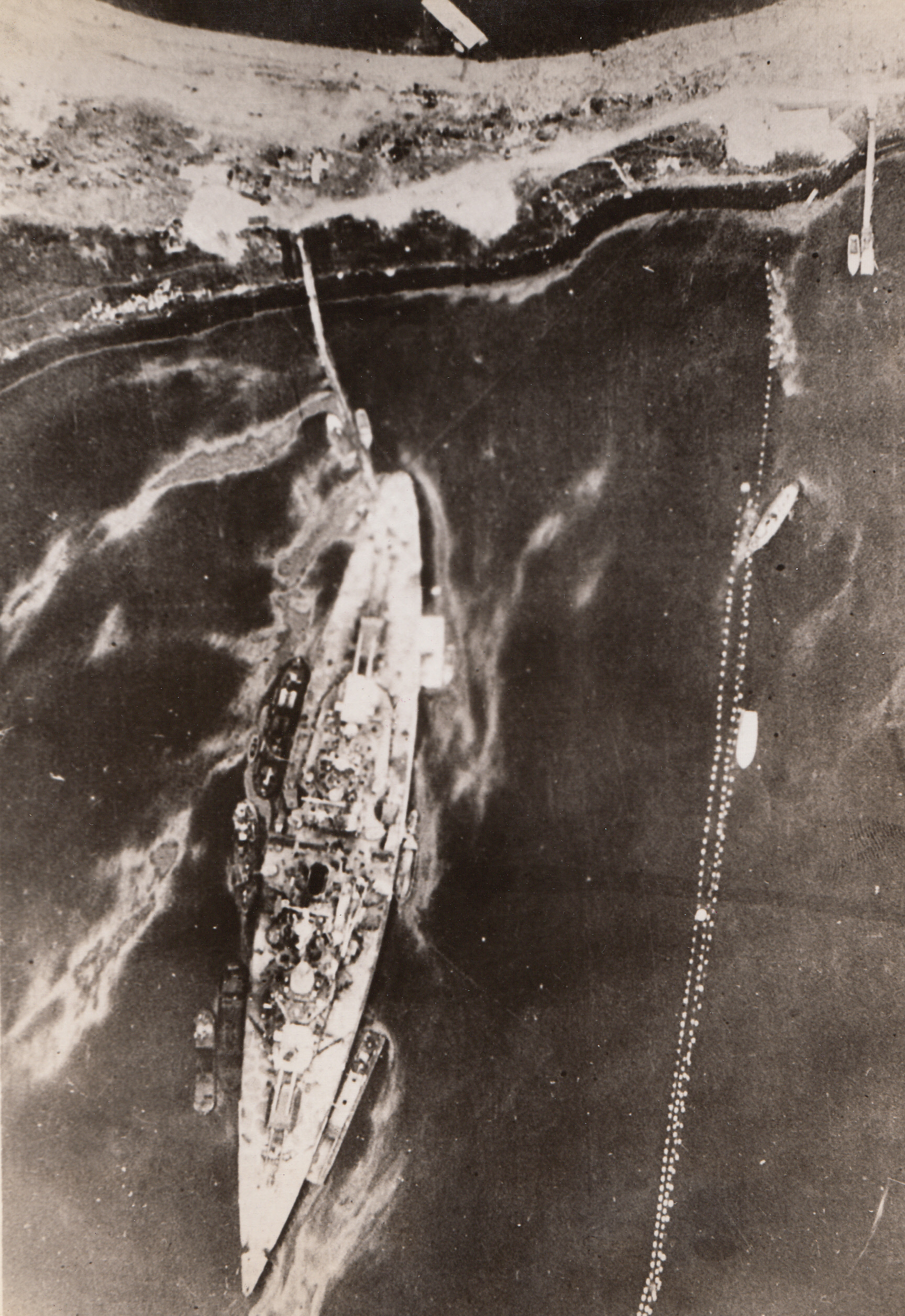 Twice-Damaged Tirpitz, 8/12/1944. NORWAY – This recent photo of the Tirpitz at her moorings in Kaafjord, Norway, was taken by an RAF reconnaissance plane of the Coastal Command. The ship was damaged in Kaafjord on two occasions, once by British submarines on Sept. 22, 1944, and again by Fleet Air Arm attack on April 3, 1944. Some of the damage has evidently been repaired, but the starboard boat and aircraft crane are missing.;
