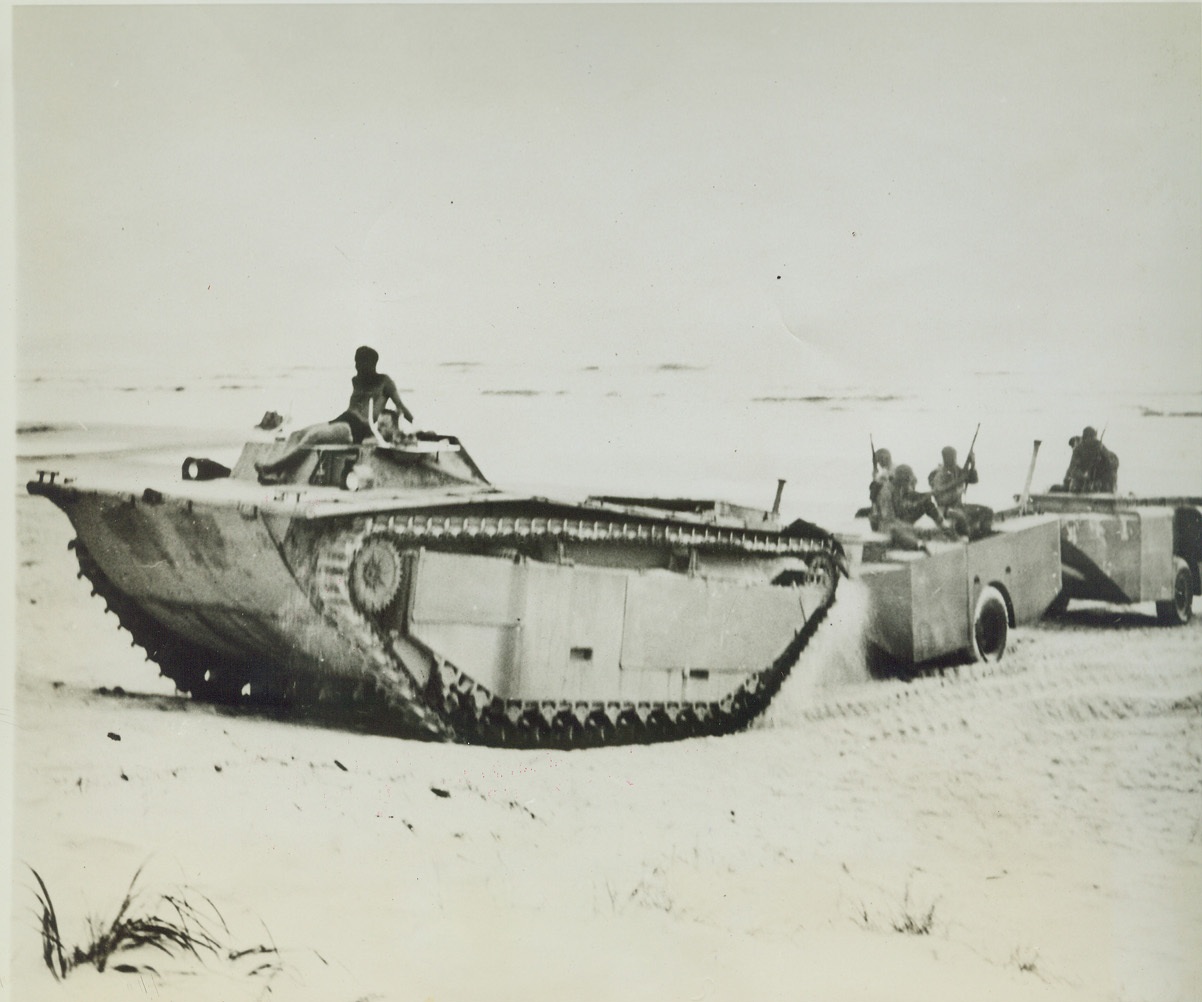 AMPHIBIOUS SUPPLY TRAILERS, 8/13/1944. CAMP LEJEUNE, N.C. – An amphibious tractor hauls ashore a new amphibious cargo trailer during a series of test by US Marines. The water-tight trailers have a capacity of 220 cubic feet. When used in combat, they will insure the delivery of supplies in a more usable condition. Credit: U.S. Marine Corps photo via OWI Radiophoto from ACME;