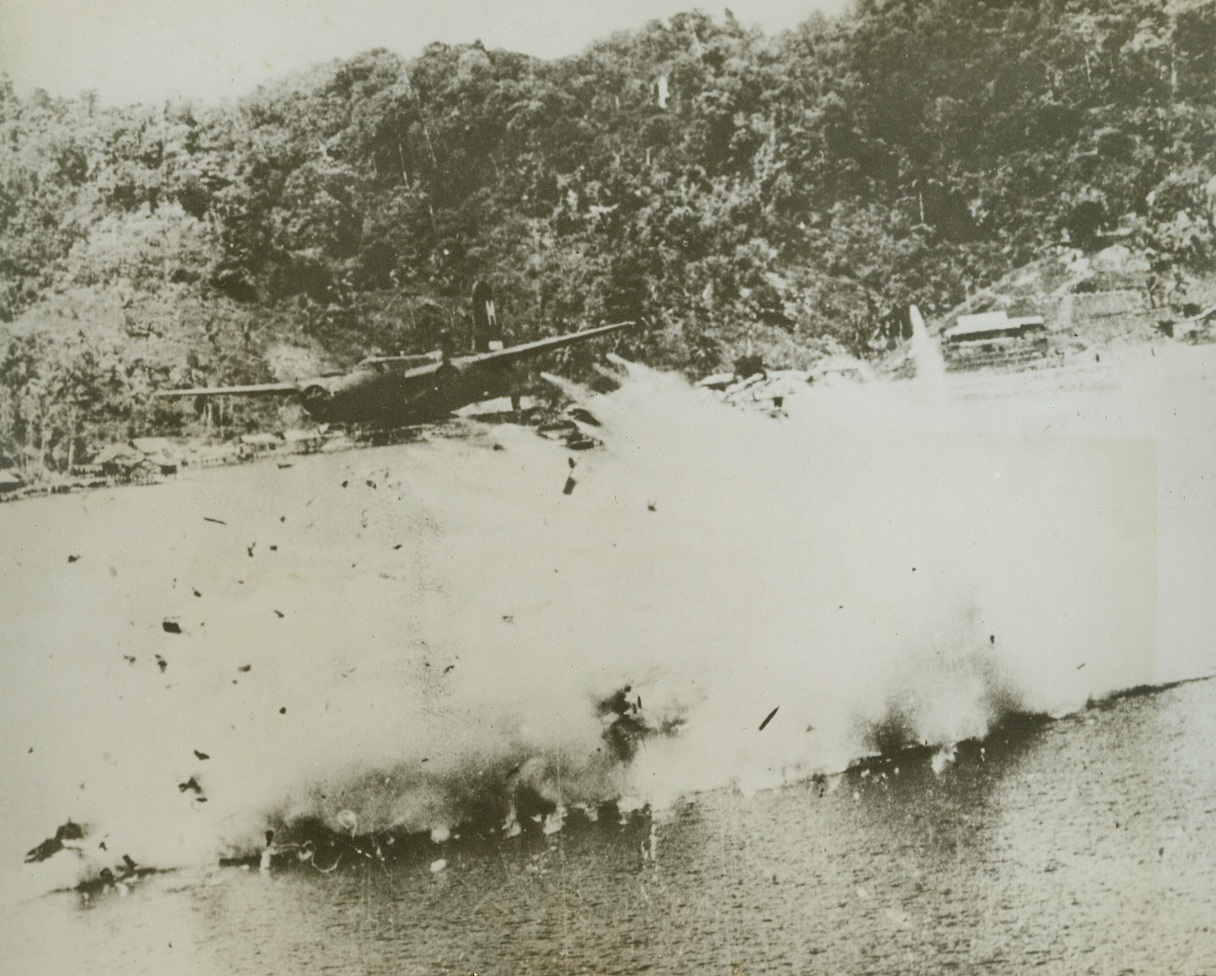 The Last Flight of a Yank Bomber – #2, 8/10/1944. KOKAS, DUTCH NEW GUINEA – What was once an A-20 attack bomber is now but a mass of smoke and flying parts as the plane explodes after crashing into the sea, a victim of a direct ack-ack hit. A companion ship heads safely homeward from a low-level raid on Jap installations at Kokas, Dutch New Guinea. Credit: USAAF photo from ACME;