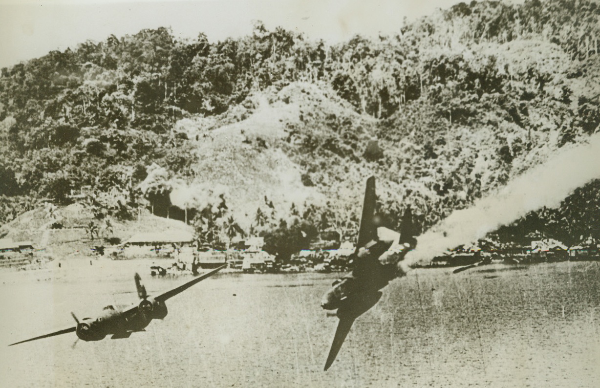 The Last Flight of a Yank Bomber – #1, 8/10/1944. KOKAS, DUTCH NEW GUINEA – In a slow, graceful dive, an A-20 attack bomber heads for the sea on its final flight after being hit by ack-ack bursts. A companion ship at left maneuvers for safety. Smoke streaming from the tail of the wounded craft marks a trail of death, as the ship was too low to permit crewmen to parachute. Both planes were returning from a low-level raid on Jap installations at Kokas, Dutch New Guinea. Credit: USAAF photo from ACME;