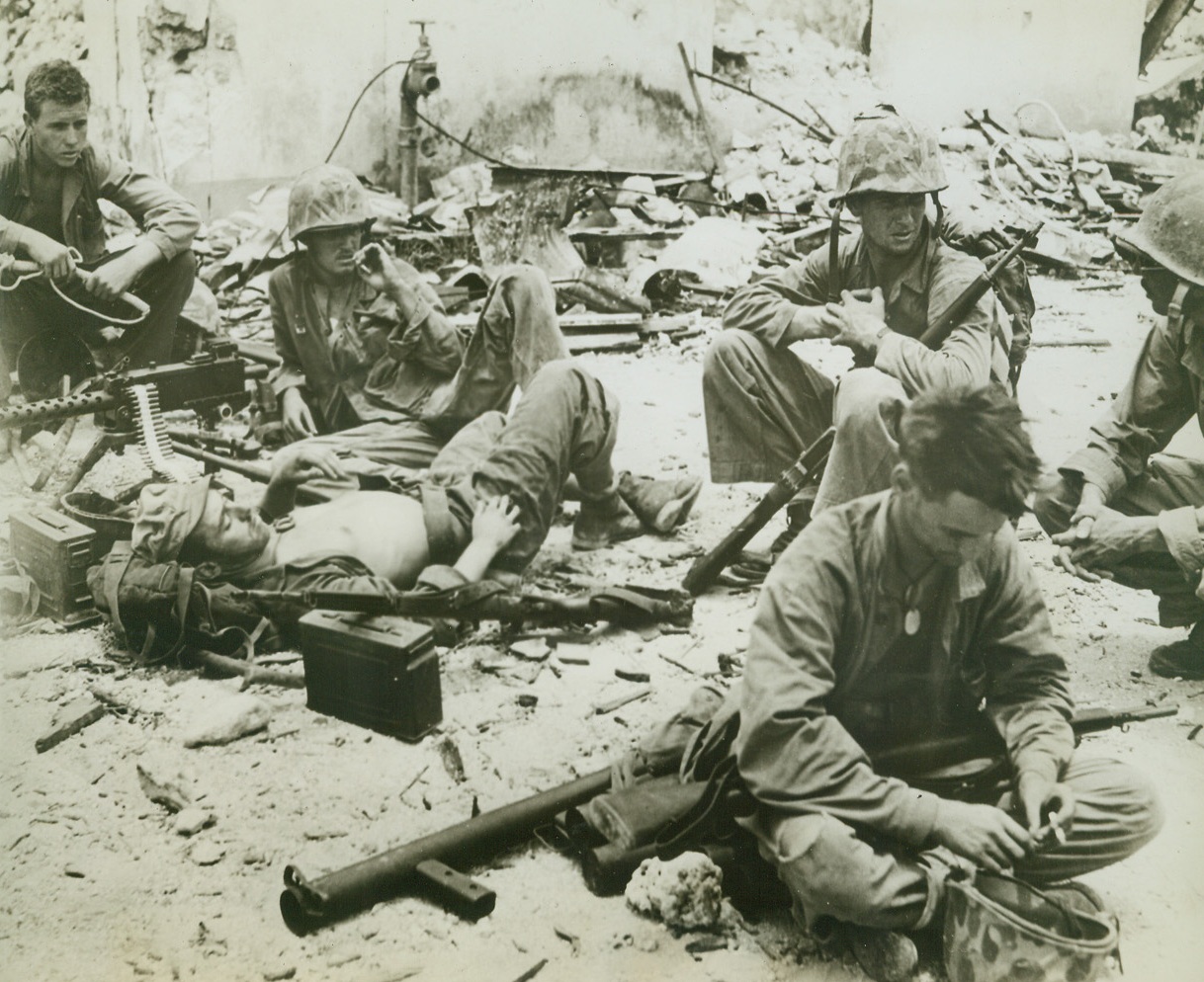 No Targets—Gun Crew Rests, 8/11/1944. AGANA, GUAM – When they ran out of Japs to shoot at on Agana, these gun crew members laid down their arms to relax for awhile, but they leave the cartridge belt in their gun—just in case. Left to right: Pfc. W. C. Dean, Meridian, Miss.; Pfc. R. A. Rouse, Cincinnati, Oh.; Pfc. E. J. Bernier (lying down), River Rouge, Michigan; and Cpl. T. L. McHugh, Cincinnati, Oh. Men in foreground and at extreme right are unidentified. All are of the Third Marine Division Credit: ACME;