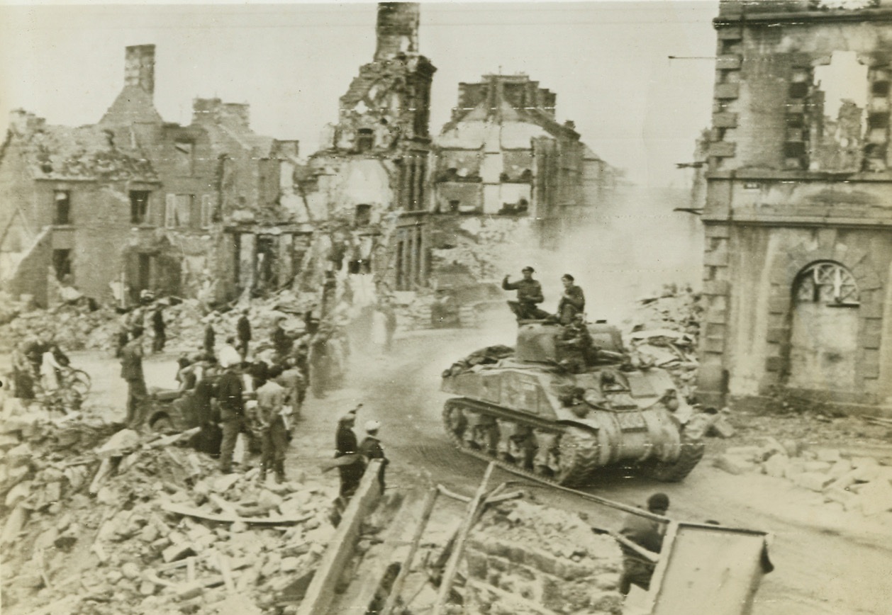 Enroute to Pincer the Germans, 8/20/1944. Flers, France — Townspeople in the bomb-wrecked, shell-ridden town of Flers line the streets to cheer British soldiers who move on in their “General Sherman” tanks to close the gap at Falaise and trap the German forces fleeing toward Paris. This is a British War Office photo. Credit: US Army photo from ACME;