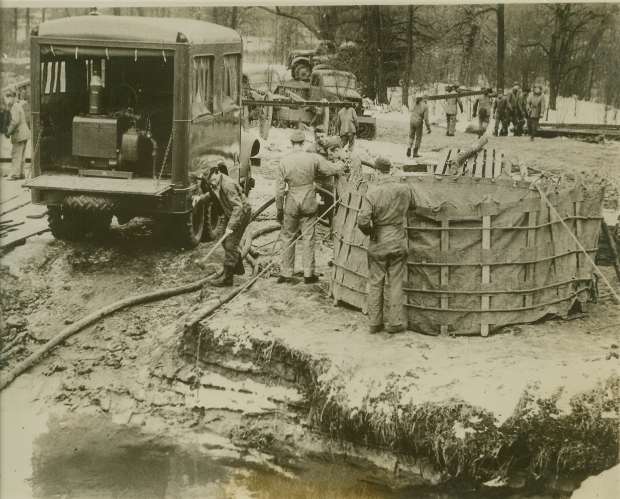 NEW MOBILE WATER PLANT, 2/1/41 FORT CUSTER, MICHIGAN- The Army is proud of this machine, a mobile water plant that pumps, purifies and delivers 150,000 gallons of water every twenty-four hours. Each unit carries four canvas 5,000-gallon tanks, one of which is shown at right of truck, and can start delivering at full capacity 30 minutes after reaching water source. Army engineers are pictured testing the machine at Fort Custer, Michigan. Credit: OWI Radiophoto from ACME;