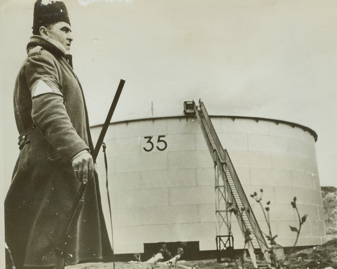 Near East Oil Fields Rumored German Coal, 3/7/41 Ankara, Turkey—Travelers from Bucharest arrived here March 7 report that Germany army officers in Rumania are talking openly of the “coming invasion” of the Iraq and Mosul oilfields which supply the vital fuel for the British army in the Near East. The attack, they say, may come through Turkey, or Russia, or across the Black Sea. The ancient land of Iraq has some of the most productive oil fields in the world. They are well-guarded by both Iraq and British forces. Above, an Iraq Petroleum Company watchman, wearing uniform and official arm badge, stands guard at oil tanks to prevent sabotage. (Foto from file) Credit: ACME.;