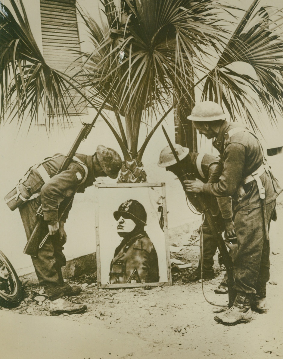 GETTING THE LAST LAUGH, 3/11/41 DERNA—These British infantrymen who participated in the capture of Derna counted this portrait of Mussolini among their prizes of war. The Tommies are getting quite a laugh from the “bull-dog” expression.;