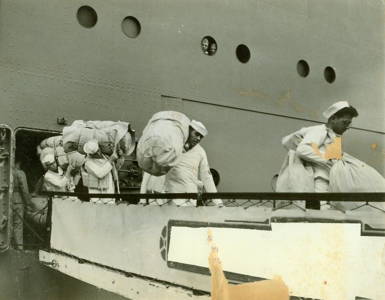 Bound for shore at an American Pacific outpost, 1/3/1942. SOMEWHERE-IN-THE-PACIFIC – Carrying their sea-bags, U.S. sailors go down the gangplank at an American possession in the Pacific, where they are arrived to support forces under attack by the Japanese. Behind them a soldier waits to descend. Passed by U.S. Navy Censor, these are the first pictures to be brought back showing a U.S. troop convoy Pacific-bound. CREDIT LINE (ACME) 1-3-42;