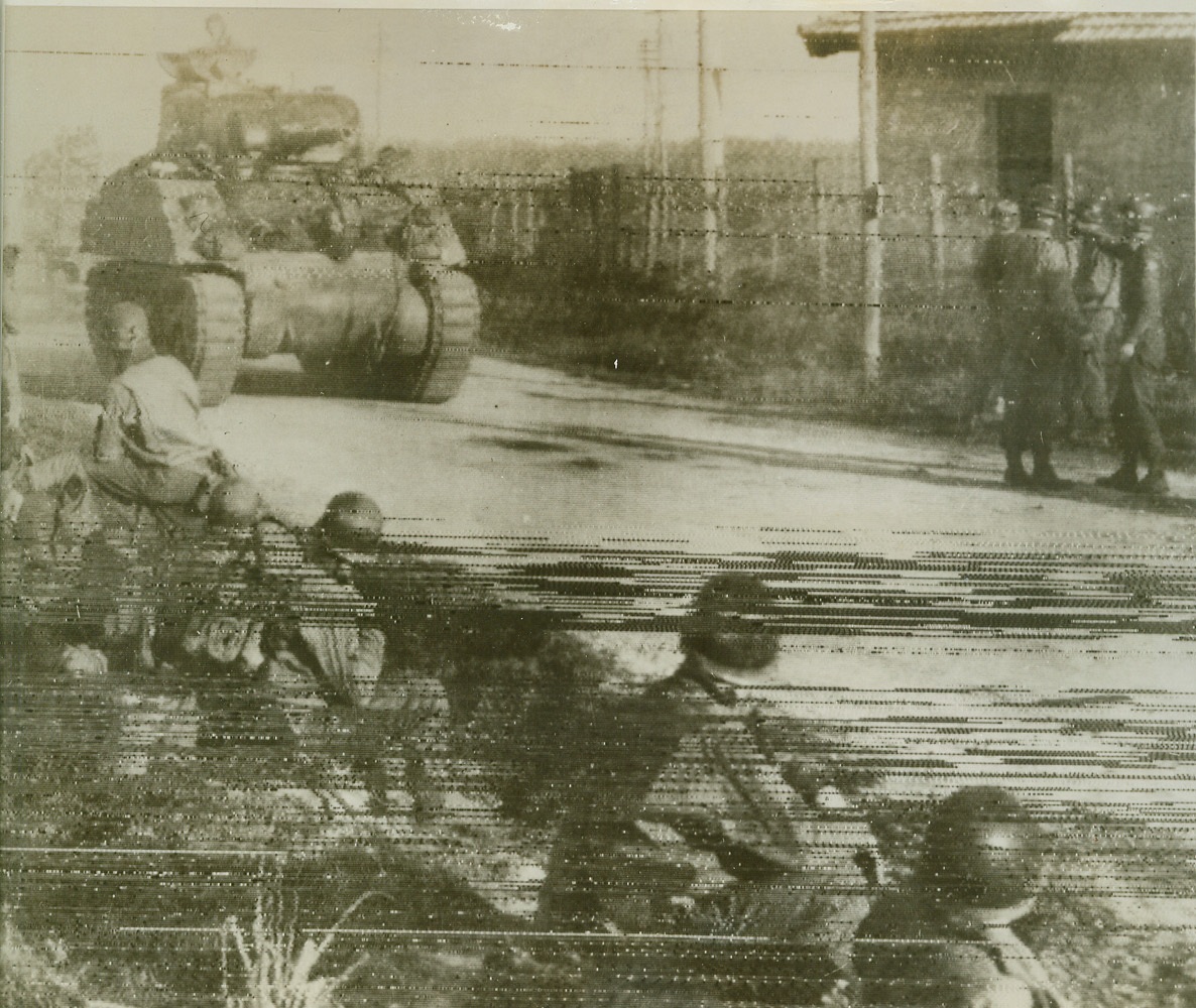 5th Army Tank Heads for Rome, 1/26/1944. Nettuno, Italy – A 5th Army tank rolls inland along the new “Road to Rome” as men, equipment and supplies pour ashore almost unopposed at Allied bridgeheads south of Rome. This photo, taken near Nettuno, was flashed to New York by radio tonight. Credit: (Stars and Stripes photo thru OWI Radiophoto from ACME)